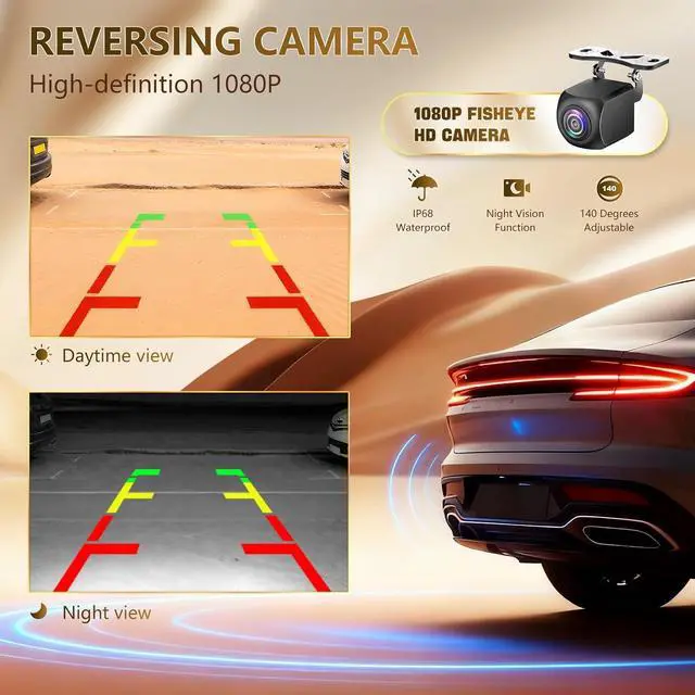 1080P Rearview: 1080P Fisheye HD Camera, IP68 Waterproof, uses the latest camera chip, which not only has excellent image output, but also has amazing performance in strong light and dark light, and has night vision function. Its bracket can also be adjusted, and the 140° Wide Angle Optical Glass HD Lens guarantees a complete lens to ensure safe driving.