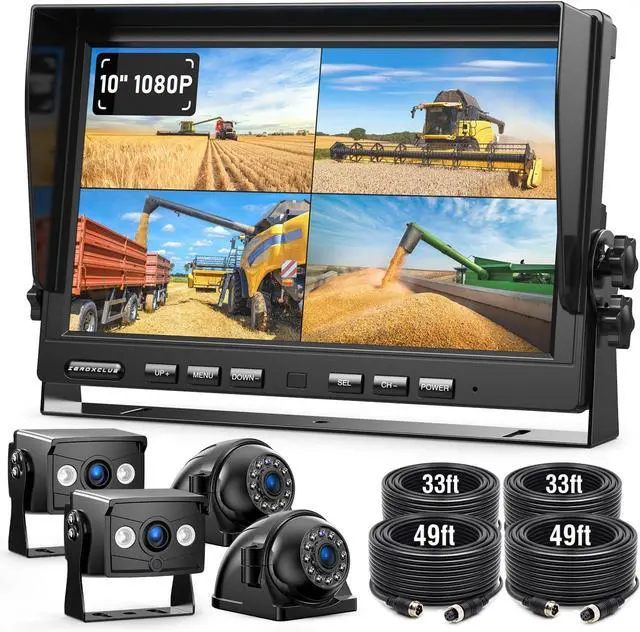 Upgraded Wired Backup Camera System: This wired backup camera system includes a 10 inch monitor and 4 wired backup camera. The system features 10G high vibration resistance, suitable for large vehicles such as farm tractors, combines, cotton pickers, farm sprayers, bulldozers, trucks, RVs, trailes, skid steer loaders, snowplows, forklifts, excavators, heavy equipment, etc.