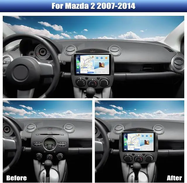 • Android 15 Car StereoFits for Mazda 2 2007-2014.Android 15 system Quad 4 Core and 4GB RAM + 128GB ROM ensure smooth operation and fast response.9 inch capacitive 2.5D tempered glass touch screen, with high resolution 1280*720 IPS.Clearer picture and richer colors.