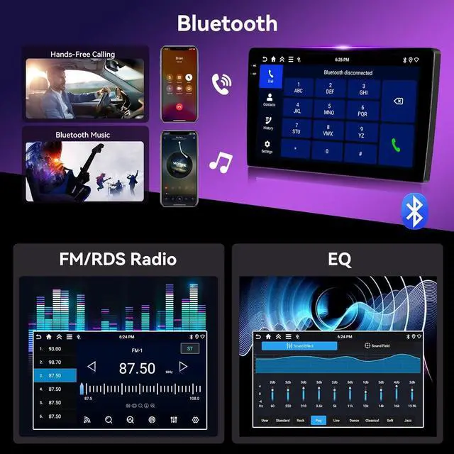 Split-screen function&EQ Setting: The 9-inch radio touch screen supports split-screen function, which can display two software interfaces at the same time. For example, while you are looking at the GPS navigation map while driving, you can also display the music interface side by side on one screen, so that the two software interfaces can appear at the same time. EQ equalizer with excellent noise reduction, bass enhanced amplification creates an immersive music feast for you.