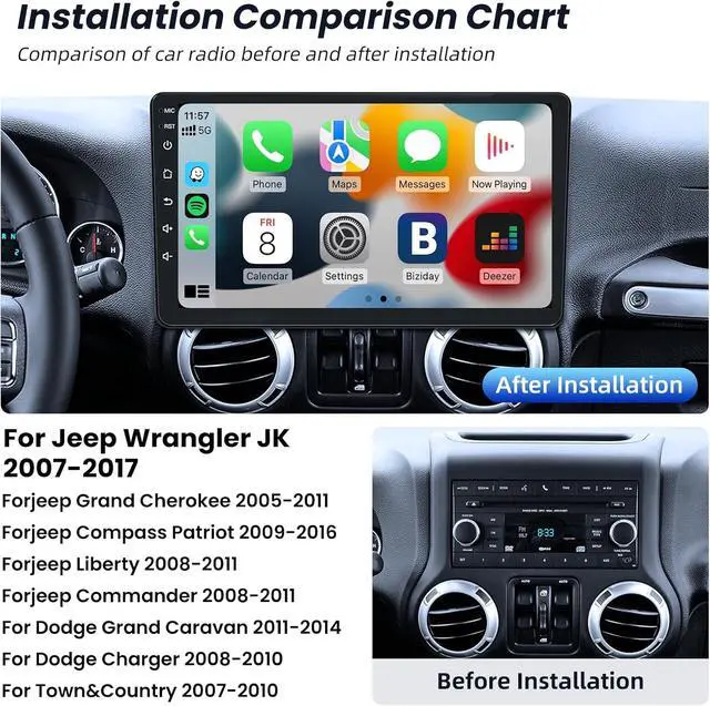 Applicable Car ModelsThis car radio for Jeep Wrangler/Unlimited 2007-2017, for Jeep Patriot & Compass 2009-2016, for Jeep Grand Cherokee 2005-2011, for Jeep Liberty & Commander 2008-2011. If you have any questions about the product, please send us pictures so that we can recommend a suitable car stereo for you