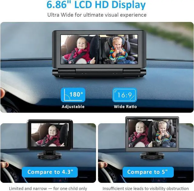 6.86 Wide Display with HD Resolution: Our baby car mirror features a 6.86 -inch 1080P HD display that strikes the perfect balance between a crystal-clear image and an expansive field of view. Unlike typical 4.3 -inch or 5-inch screens, this larger adjustable display provides a significantly wider perspective without forcing you to squint or blocking your view. Additionally, each camera offers a wide viewing angle to ensure a clearly consistent image from all directions.
