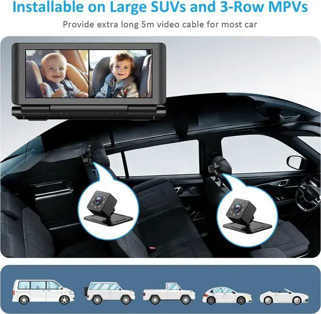 Wide Application: Featuring a 360° adjustable camera, this in-car baby monitor fits any vehiclecar, SUV, or truckand adapts to all seat sizes. Easily adjust it to keep a clear view of your child, no matter where they sit. With its 5m( 16.4 ft) video cable, the monitor can be installed in most vehicles without requiring extra extension cords. The anti-shake suction mount stays securely in place even on bumpy roads, offering reliable stability for every trip.