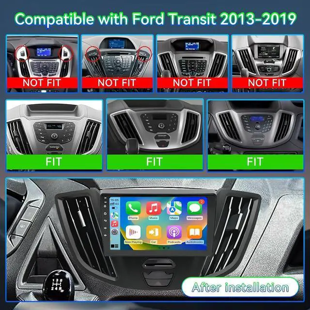 Perfectly compatible with Ford Transit 2013-2019This 9-inch Android 13 car audio system is designed specifically compatible with Ford Transit 150 250 350 2013 2014 2015 2016 2017 2018 2019, achieving perfect compatibility. It has 64GB of storage. Please check your vehicle' s year, size, and dashboard shape to ensure compatibility. Enjoy a hassle-free installation experience with our professional guidance.
