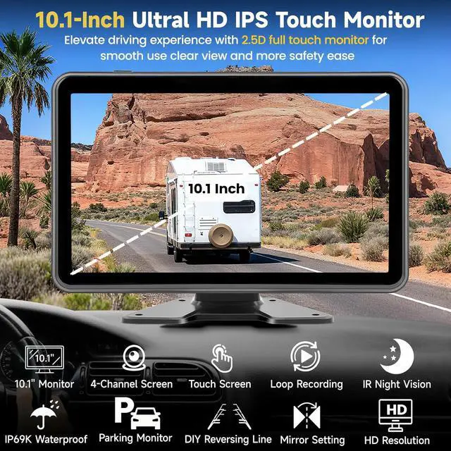 10.1 -inch HD Touch MonitorEquipped with HD screen for clearer images, this backup camera features 10.1 -inch touch screen, supporting 4-Channel, can easily check trailer hitch alignment while reversing or monitor the blind spots of RV/Trucks when changing lanes. The monitor offers an adjustable viewing angle to rotate the screen for optimal positioning, delivers both brightness and high-quality color images.