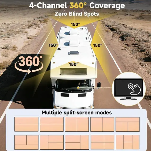 4-Channel 360° View No Blind SpotFeaturing 4 HD 1080P cameras (front/rear/left/right), This backup camera for truck removes all blind spots, whether navigating narrow roads in trucks, descending steep mountain passes in RVs, or backing into tight loading zones with vans. See every critical angle simultaneously, ensuring maximum safety and confidence in any driving scenario.