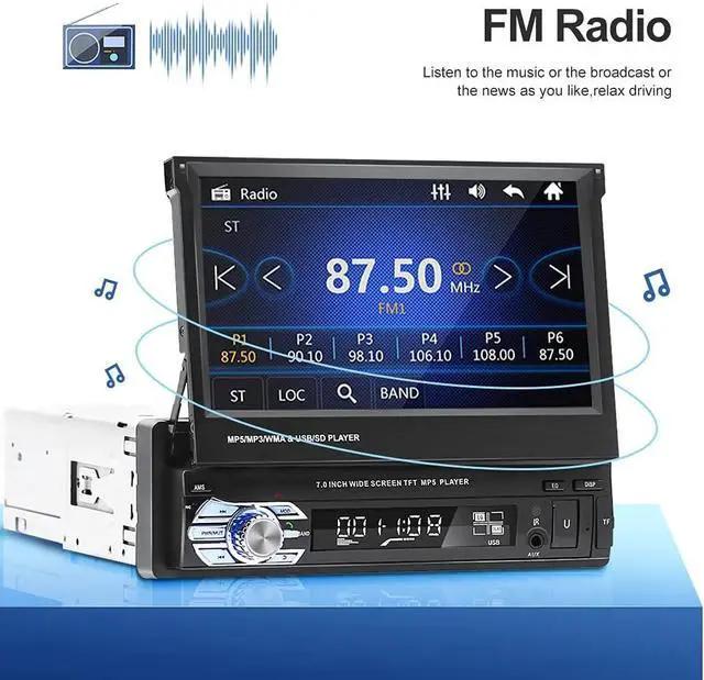 Bluetooth & FM RadioThis single din car stereo with bluetooth 4.0, support handsfree calls, phonebook download, bluetooth music play. High-quality digital stereo FM radio with 18 presets, 87.5M -108M FM frequency, automatic channel search