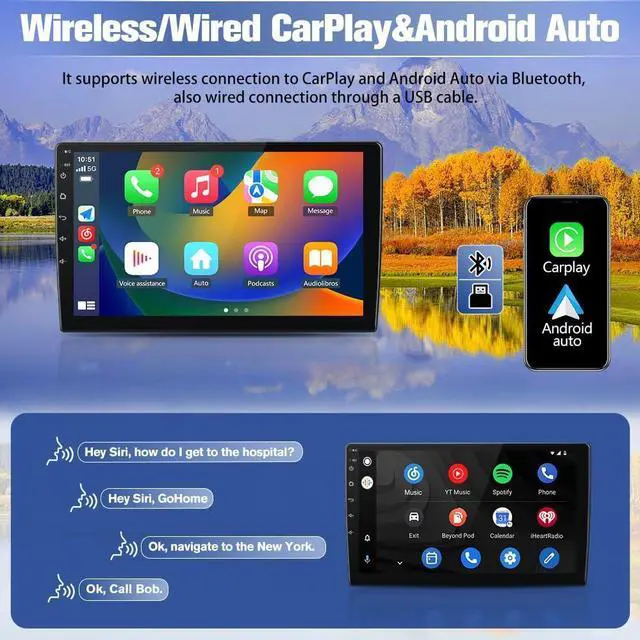 Wireless CarPlay & Android Auto This android head unit supports both wireless and wired Apple CarPlay and Android Auto, giving you full hands-free access to navigation, calls, messages, and music. Easily connect your phone via Bluetooth or USB and use voice control with Siri or Assistant of voice. It also supports screen mirroring to display your phones apps directly on the touch screen radio for car.