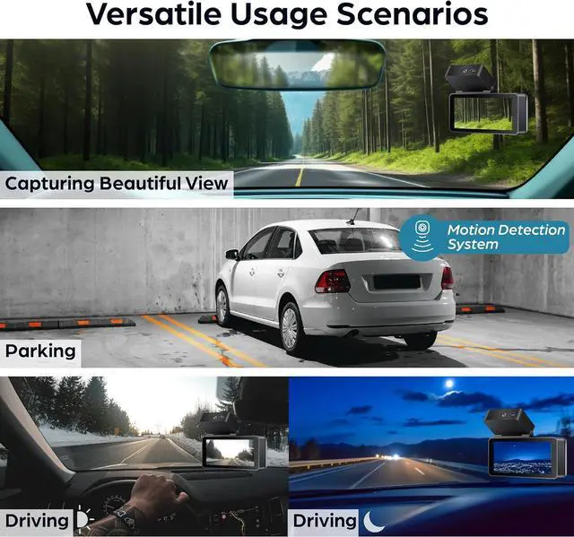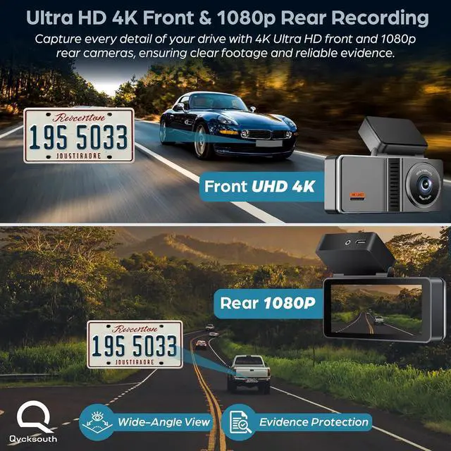 4K+1080P UHD Dual Dash Cam The front camera records in stunning 4K UHD (3840x2160P @30fps), while the rear camera captures 1080P resolution with a 145° wide-angle lens. This ensures crystal-clear footage for accident evidence and insurance claims, making it ideal for family vehicles and ride-sharing services.