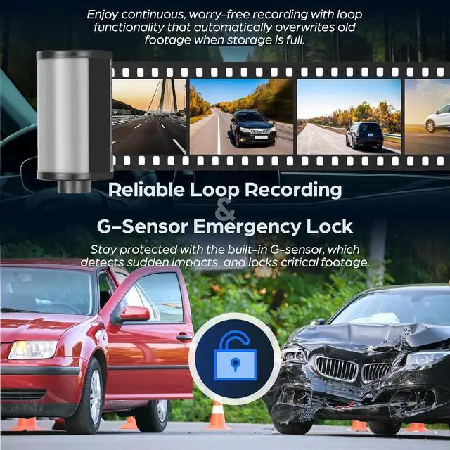 Loop Recording & G-Sensor Protection Continuous loop recording automatically overwrites old files when the storage is full, ensuring uninterrupted recording. The built-in G-Sensor detects collisions and locks crucial footage to prevent overwriting, safeguarding important moments.