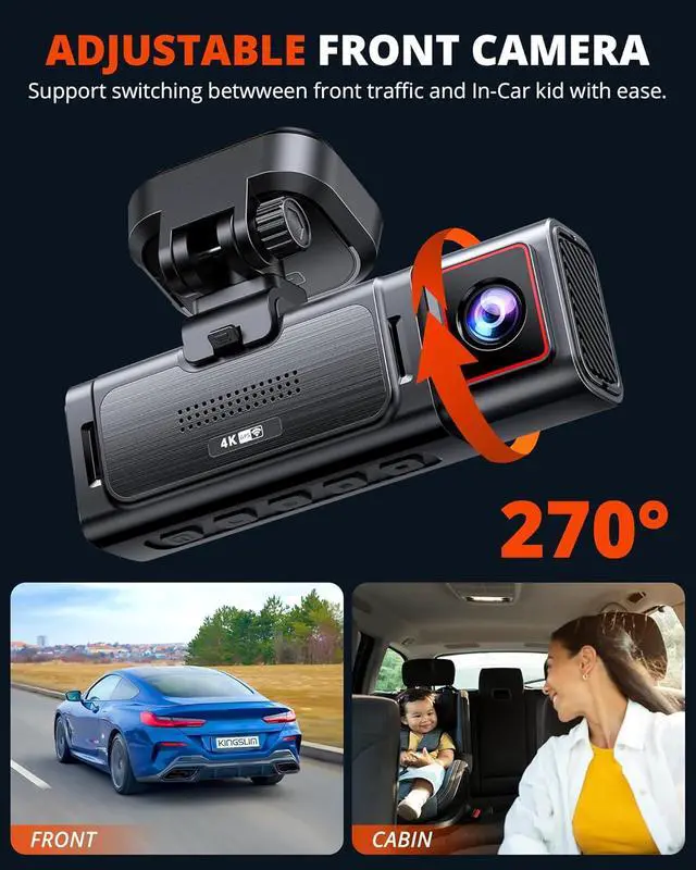 270° Rotatable Dash Camera Lens: Front dashcam is equipped with a 270° rotatable camera lens, which support turning the shooting lens towards the inside or front of the car. With 2K rear camera, you can adjust the camera lens to record front and rear or to record inside and rear.