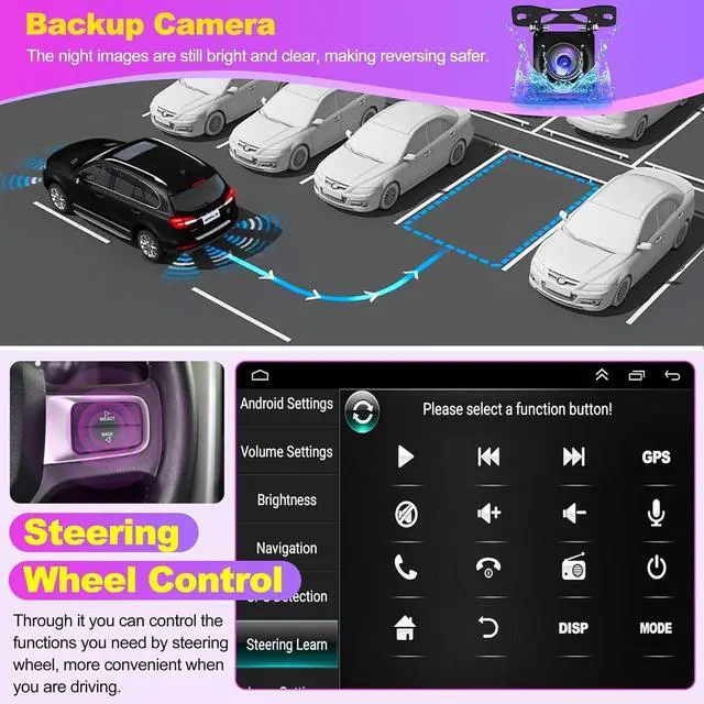Powerful Functions: Upgrade your driving experience with our car stereo, featuring an Android 12 system powered by a Quad-Core CPU. With 4GB RAM and 64GB ROM, this system ensures a smooth, responsive user experience. Enjoy features like CarPlay, Android Auto, GPS navigation, Bluetooth connectivity, FM radio, EQ settings, WiFi connection, backup camera support, audio/video output, AUX input, an external microphone, and steering wheel control for seamless operation.