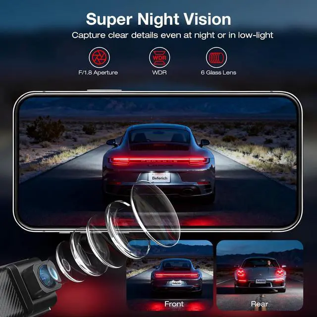 Superior Night Vision&WDR TechnologyOur dashcams for cars provides night vision, dash cam' s 6-layer F/ 1.8 aperture lens and HDR/WDR technology, which let you capture important details clearly even at deep night.