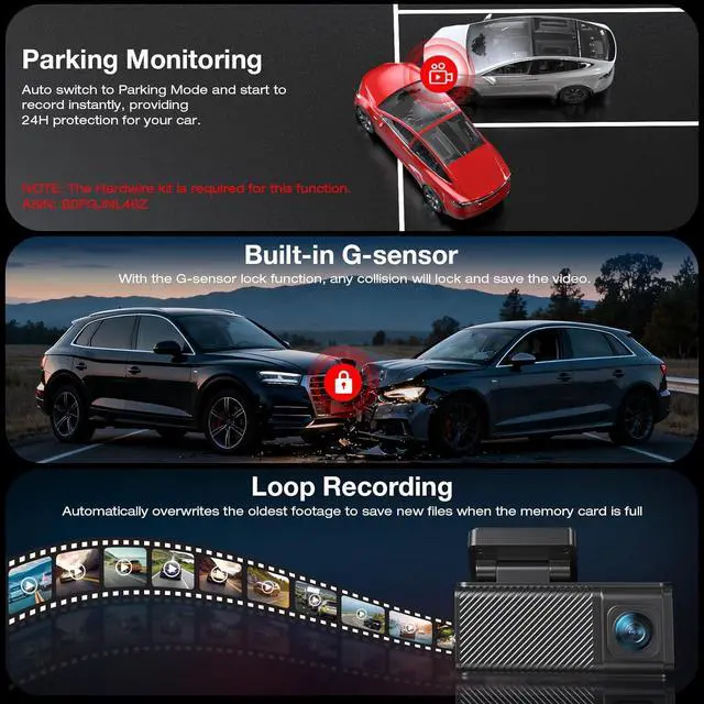 Parking Monitor ModesThis J18 car dashboard camera offers 24/7 parking monitoring modes. the 4k dash cam turns off after parking but activates upon detecting vibrations or collisions, recording and locking a 15seconds short video to protect your important videos from being overwritten or deleted. If you want to let the dash cam front and rear provide 24/7 monitoring to deter thieves and vandals; installation of a hardwiring kit is required (Sold separately, ASIN: B0FGJNL46Z )