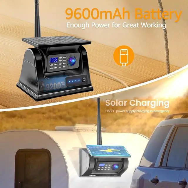 Solar Camera 2 charging modes-solar or USB-C and it has 9600 mAh battery. URFRU camera can great working in storm, raining or snow, because it was waterproof IP 69. also, its infrared night vision function ensure the camera would displaying clear even if in darkness.