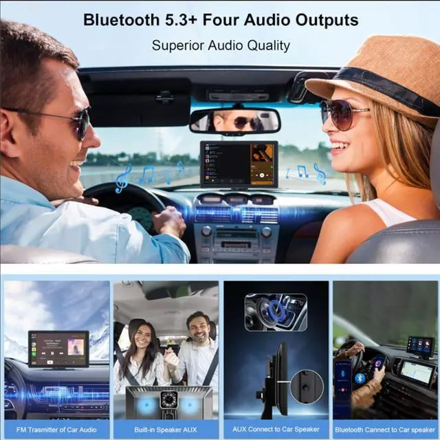 Multiple Audio Output Modes for Superior Sound Quality Our device offers versatile audio options, including Bluetooth, built-in speakers, AUX, and FM transmitter, to connect seamlessly with your car' s audio system. Enjoy hands-free calls and high-quality music playback whether youre using carplay stereo or any standard audio receiver, ensuring an immersive, uninterrupted listening experience