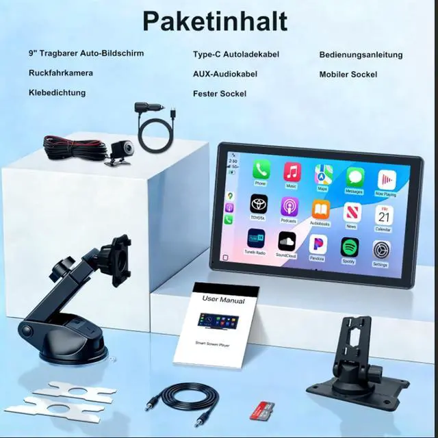 Easy Installation & Universal Compatibility Designed for all vehicles (cars, trucks, RVs, etc. ), our carplay screen for car operates within a DC 7V32V range. The adjustable adhesive mount ensures a secure and customizable installation on your dashboard, while the included car charger and USB port keep your device powered during the driveproviding a truly portable wireless carplay screen solution