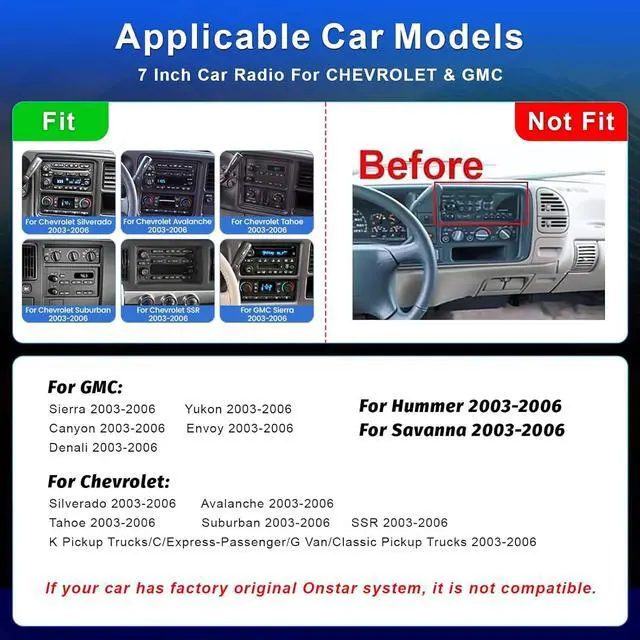 & Hummer: This stereo fits 2003-2006 Chevrolet Silverado (1500/2500/3500), Tahoe, Suburban, Avalanche, Impala, SSR. Also fits 2003-2006 GMC Sierra, Yukon, Canyon, Envoy, Denali and Hummer H2 (2003-2006). Whether you need a 2003 Chevy Silverado radio replacement or an upgrade for later years, this plug-and-play unit includes harness, dash frame, and pry tool. Send us a photo of your console if unsure.