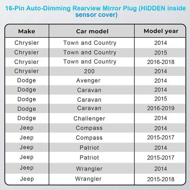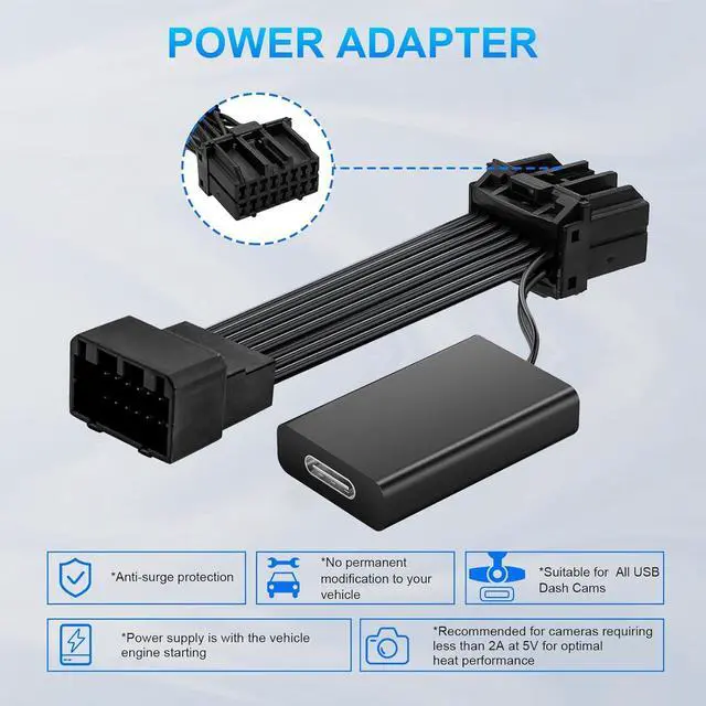 Vehicle Compatibility & Installation: Please confirm your vehicle has a 16-pin connector on the rearview mirror bracket (as shown in our product images) before purchasing. This dash cam power adapter plugs directly into the rearview mirror.