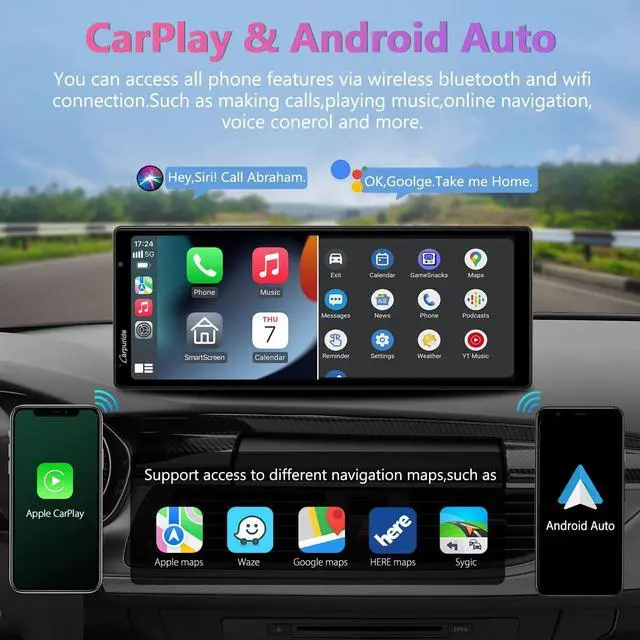 Wirelessly 9.3 inches IPS Smart DisplayCARPURIDE 9.3 " portable car stereo compatible with Carplay & Android Auto. After link wirelessly, puting all your phones best features in a clean, safe, and easy-to-use hd touchscreen, wirelessly handle gps navigation, messaging, phone calls, bluetooth music, Siri. Never worry about heating and battery damage caused by using your mobile phone for navigation for a long time. This 9.3 -inch large screen is suitable for a wide field of view in the car.