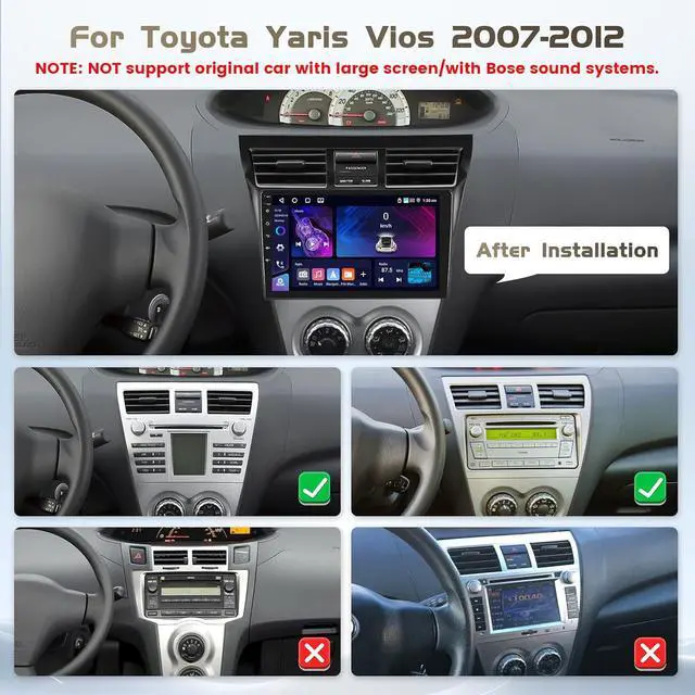 Compatibility]: For Toyota Yaris Vios 2007 2008 2009 2010 2011 2012 2013 car radio stereo. Seamless replacement of original dash panel, no wiring modifications required. Please send us your car' s model, produce year and a car dashboard picture by chat, we will help you to check if this car stereo is suitable for your car and equip all the cables for you
