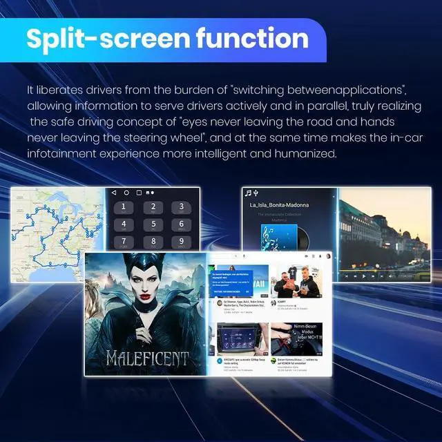 Crystal-Clear IPS Touchscreen & Split Screen Function Enjoy a superior visual experience with the 9-inch IPS capacitive touchscreen featuring 2.5D curved glass and 1080P resolution. The split-screen function enables you to run two applications simultaneously, such as navigation and music, making your drives more efficient and entertaining.