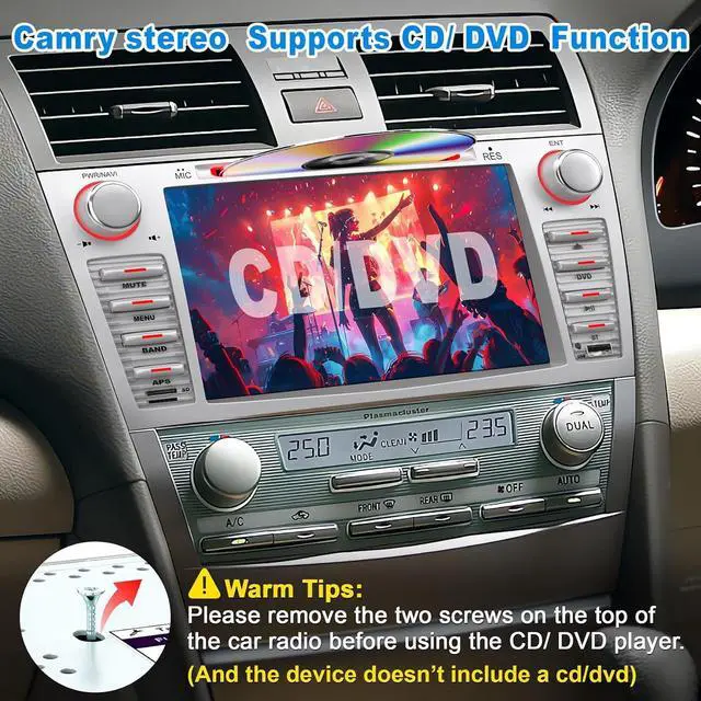 Camry Radio with CD/DVD Player--This Cary Stereo supports DVD playback, so you can play any disc and make your journey less boring. Pls remove the two screws on the top of the radio before you putting a cd or dvd