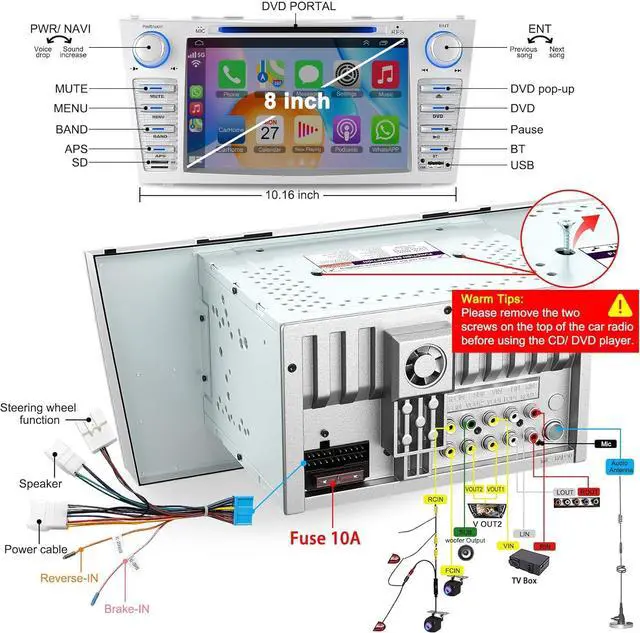 Mirror Link--The 8 inch camry stereo with DVD Player support IOS and Android phones for mirror link function, connect your smartphone to double din car stereo apple carplay via a original USB cable, easily connect and sync you phone any content to the car player displayed on a large screen.