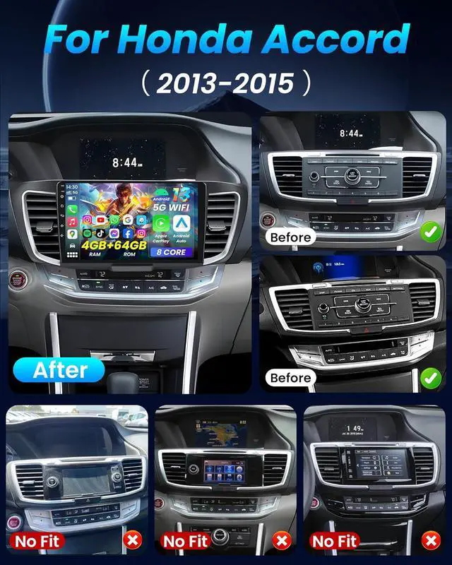 • Applicable Car ModelsDesigned with Android 15 system, 10.1 inch 2.5D 1280*800 HD touch screen, this android head unit is perfectly suitable for 2013 2014 2015 Honda Accord 9th EX-L Radio with Auto A/C, including a Canbus (Not Support: OEM Multimedia Control / OEM Side Camera / Dynamic Guide Lines / OEM Subwoofer) Note: Not Fit: Original Radio with Manual A/C or Full Touch Screen (Please confirm the radio type and CD plug before order)