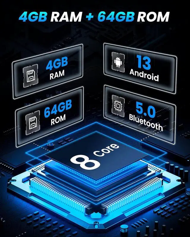 High-Performance 8-Core ProcessorExperience smooth, lag-free performance with the powerful 8-core processor, coupled with 4GB of RAM and 64GB of internal storage. This high-performance configuration ensures faster boot-up times, seamless multitasking, and quick app switching. Whether you' re running multiple apps, streaming media, or navigating, this head unit handles it all effortlessly, delivering exceptional speed and responsiveness for a premium in-car experience.