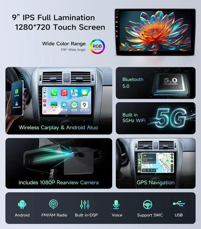 • Powerful FunctionsUpgrade your Toyota Corolla with our 9-inch Android 13 car stereo. Featuring a responsive 2GB RAM and 32GB ROM, this plug-and-play unit seamlessly integrates into your vehicle's dashboard, offering a modern and intuitive driving experience.