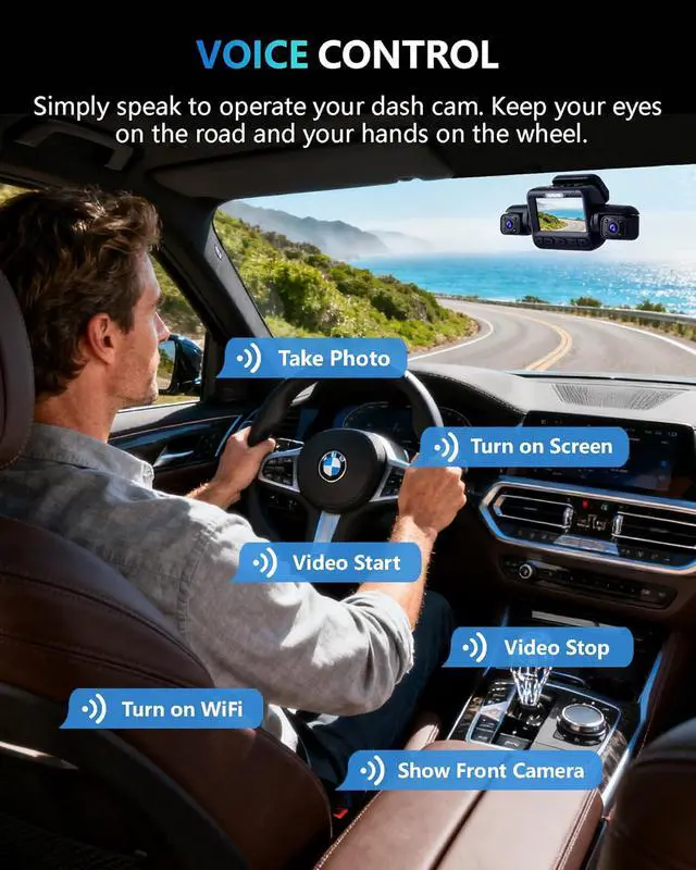 Voice Control Dash Cam Dash camera voice control function lets you control the dashboard camera with spoken commands (English) so you can keep your hands on the wheel and focus on driving. Car camera everything is easier and more convenient as you can simply speak take photo, start video, turn on/off audio, turn on /off wifi, turn
