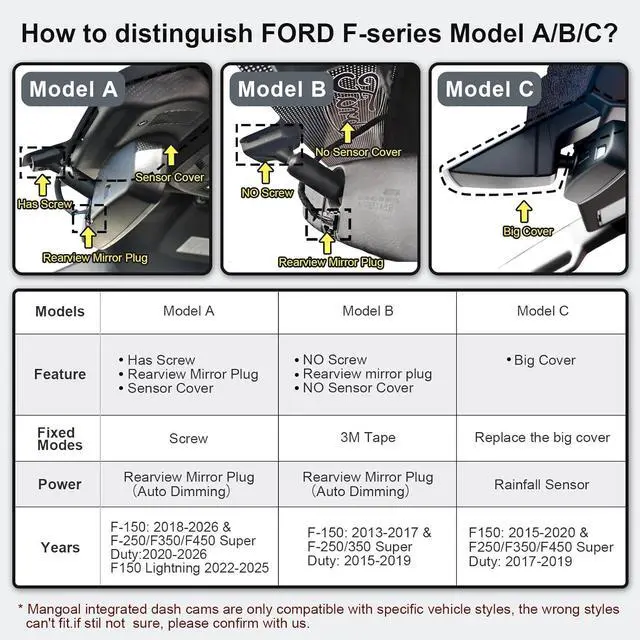 Please note 1. If your car doesn' t have an auto-dimming function, you can also use a Rainfall Sensor Power Adapter to draw power. Please search for ASIN B0FVWQ2HML or B0FVWPSXBZ. 2. mangoal STARVIS 2 Front 4K HDR Dash Cam IMX678, Custom Fit for Ford F150 2018-2026 F250/F350/F450 Super Duty 2020-2026 (Model A), 5GHz WiFi, GPS, Supports 512GB Max, Please search asin B0FK4D2P74