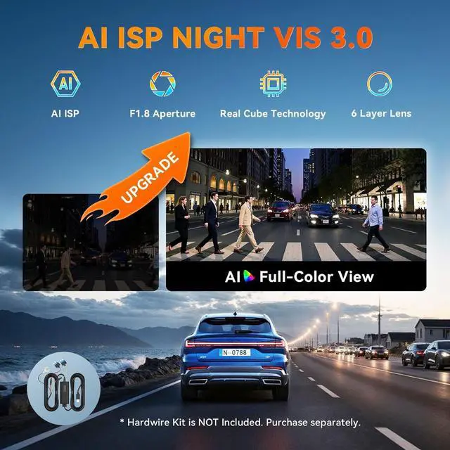 AI ISP Night Vis 2.0: Capture crystal-clear evidence with a 4K@30fps front camera (featuring HDR for superior contrast) and a 1080P rear camera. Equipped with 6 advanced optical lenses and 140° wide-angle views, this dash cam delivers high-quality video for smooth playback, reliable accident documentation, and seamless insurance claims. The dashcam supports AIISP and black light night vision, ensuring image detail and color accuracy when monitoring parking