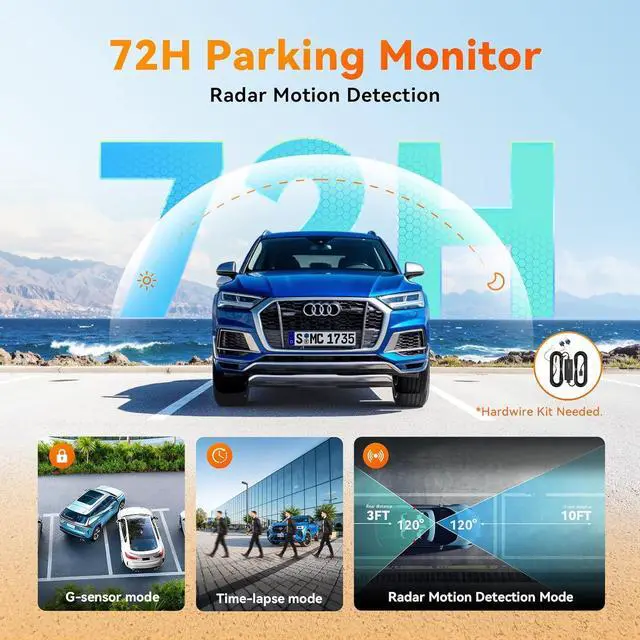 Smart 72H Parking Mode Dashcam: Protect your vehicle 24/7 with radar motion detection of car dash cam for both front and rear. When movement is detected, the dash cam automatically records 10-second video clips. Energy-saving technology enables up to 72-hour parking surveillance, while low-voltage protection prevents battery drain.