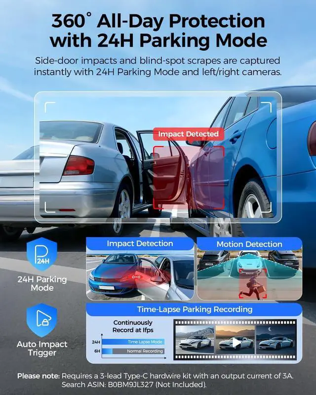 ADJUSTABLE LENSES: Customize recording angles by adjusting the direction of the lenses. M660 360 dash cam captures clear footage from the front, rear, and both sides of the drivers vehicle. AZDOME dash camera provides complete evidence for incidents like vandalism, theft, parking scrapes, and insurance fraud, ensuring the driver is covered in any situation.