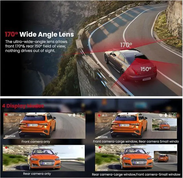 4K/ 2.5K Dual-Mode Front Camera & 170° Wide Angle Switchable 4K (3840x2160) or optimized 2.5K front recording captures critical details. Ultra-wide 170° lens minimizes blind spots for comprehensive road coverage.
