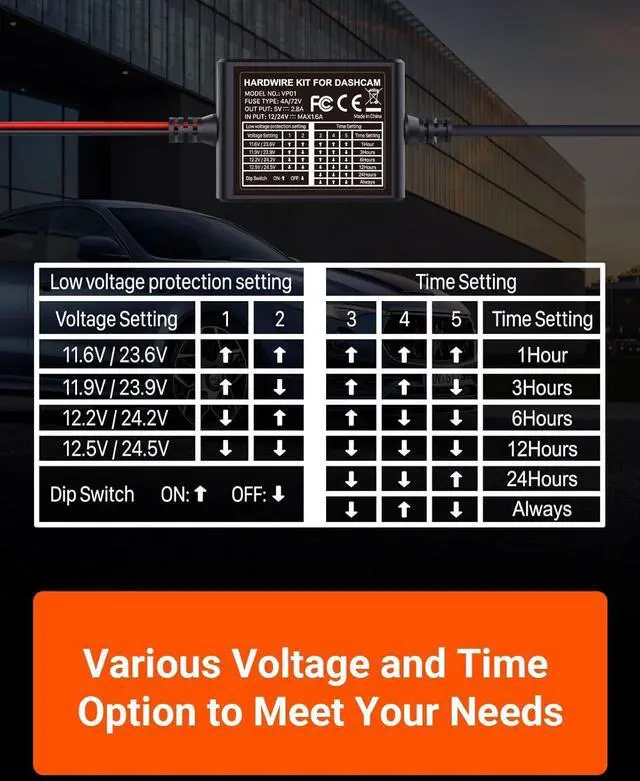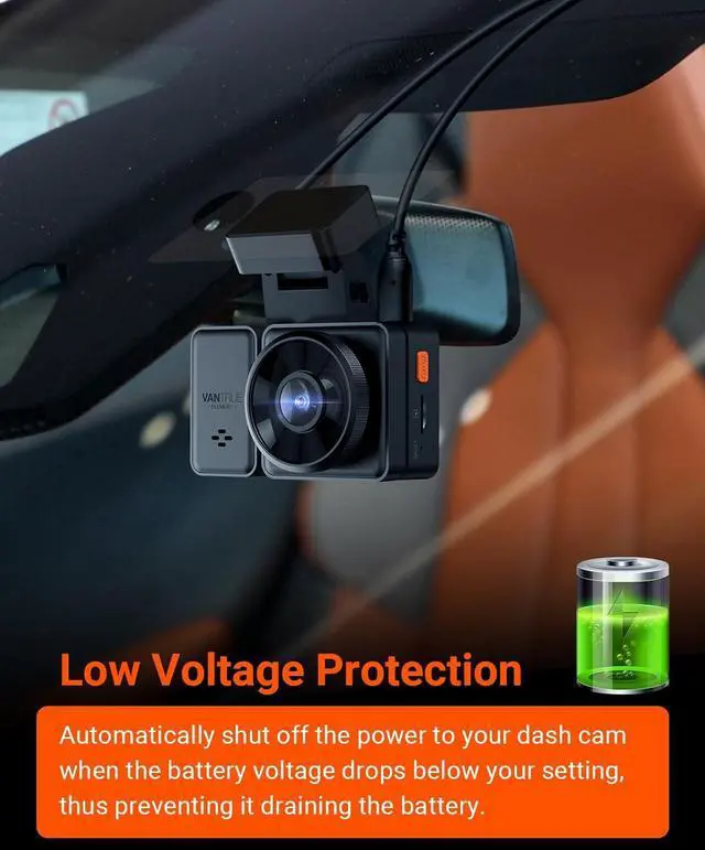 Low voltage protectionIt has a smart low voltage protection system that will automatically shut off the power to your dash cam when the battery voltage drops below your set value( 11.6V / 11.9V / 12.2V / 12.5V / 23.6V / 23.9V / 24.2V / 24.5V option available), thus preventing it draining the battery.