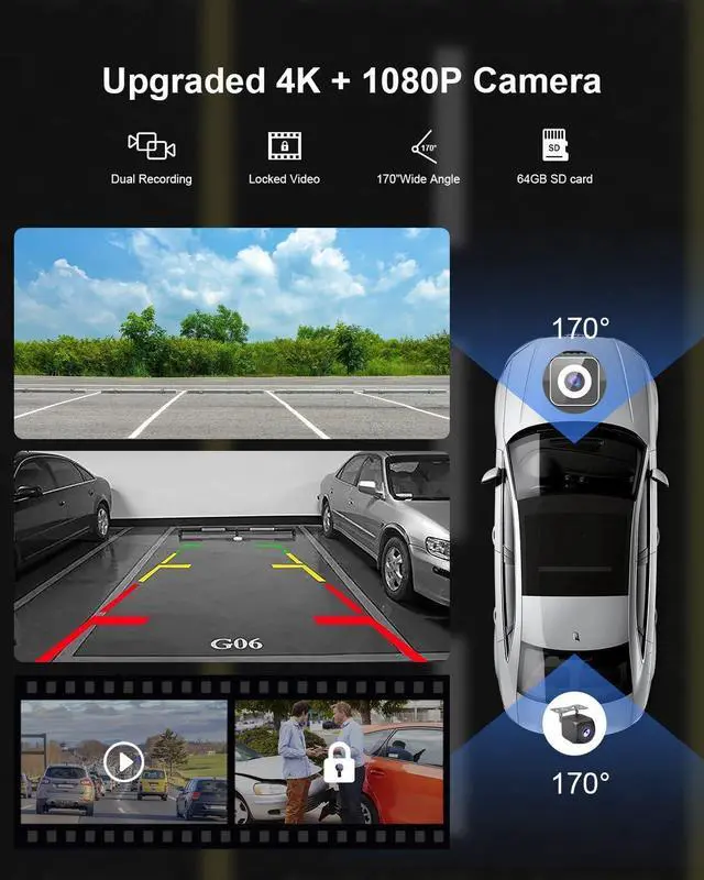 Night Vision Backup Camera: Apple carplay screen for car equipped with dual HD cameras for comprehensive safety. The 4K front dash cam records every detail in ultra-clear resolution, while the 1080P waterproof rear camera ensures safe reversing with wide-angle night vision. Loop recording and collision sensor (G-sensor) lock critical footage automatically (includes 64GB TF card).