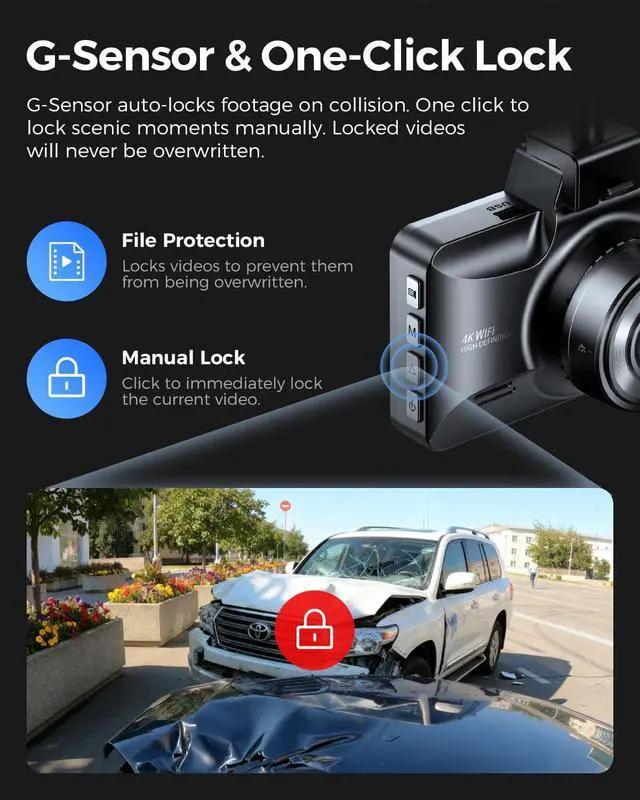Free 64GB Card & Loop Recording: M01 Max wifi car camera won' t lose any crucial evidence with loop recording function, overwriting the oldest unprotected files when the SD card is about full.