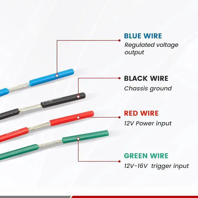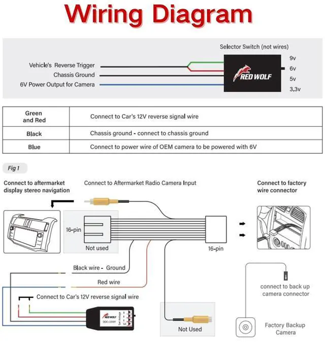 Step down interface wire adapter connection: Green and red wires connect to Car' s 12V reverse signal wire; Black wire connects to chassis ground; Blue wire connects to power wire of OEM camera to be powered with 6V