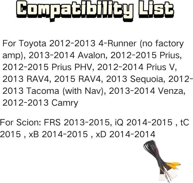 CAM TY11 T-harness compatible with Toyota 2012-2013 4-Runner (no factory amp), 2013-2014 Avalon, 2012-2015 Prius, 2012-2015 Prius PHV, 2012-2014 Prius V, 2013-2015 Rav-4, 2013 Sequoia, 2012-2013 Tacoma (with Nav), 2013-2014 Venza, 2012-2013 Camry