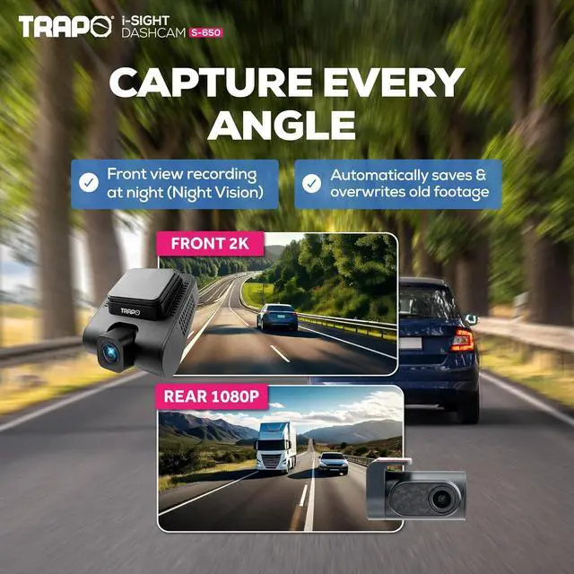 Dual Lens Car Camera Dash Cam Front and Rear Coverage. Includes a 60fps front dashcam and Full HD rear camera to monitor both directions. Car dash mount camera protects you from front and rear collisions with wide-angle views and smooth video playback.