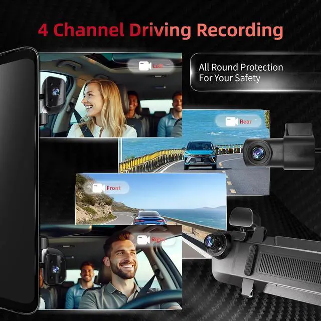4 Channel Dash CamThis mirror dash cam simultaneously captures front, rear, left, and right views in high definition. The 12" IPS touch display seamlessly replaces your factory rearview mirror, eliminating blind spots while maintaining your car' s interior aesthetics. It clearly records road conditions and traffic details, providing complete 360° coverage for comprehensive protection.