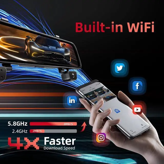 APPWith 5.8GH z high-speed Wi-Fi, transfer rates reach up to 12MB/s for quick video downloads. Pre-installed with a 128GB memory card, this 4 channel mirror dash cam supports extended recording without frequent storage concerns. Use the dedicated app to instantly view, download, and manage footage anytime, anywhere.