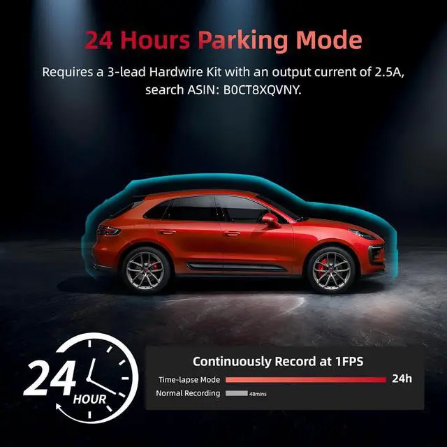 24/7 Parking ModeWith the hardwired kit (ASIN: B0FKGRJ414), the dash cam activates continuous parking surveillance, monitoring your vehicle' s surroundings even when the engine is off. Upon detecting vibration, the mirror dashcam will automatically activate and save crucial footage, ensuring uninterrupted 360° security.