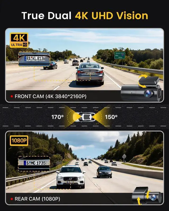 Real Ultra 4K+1080P Dash Cam Front and Rear Camera- Capture every detail with this dual dash cam that records the front at stunning 4K/2160P and the rear at crisp 1080P. For standalone operation, simply unplug the rear camera to record front footage at 4K Ultra HD 2160P/30fps. With a 170° wide-angle lens, F 1.8 aperture, and WDR-enhanced night vision, youll get clear, reliable footage even in low-light conditionsensuring nothing escapes your view.