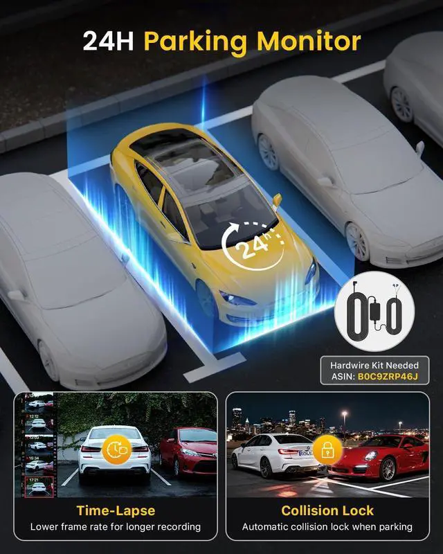 24-Hour Parking Mode Always-On Protection- When paired with the dedicated Type-C hardwire kit (NOT INCLUDED, ASIN: B0CL756HDL), the D600 dashcams for cars enables low fps recording, providing uninterrupted surveillance even when your car is off. This feature safeguards your vehicle and valuables, capturing critical evidence of vandalism or break-insoffering peace of mind wherever you are.
