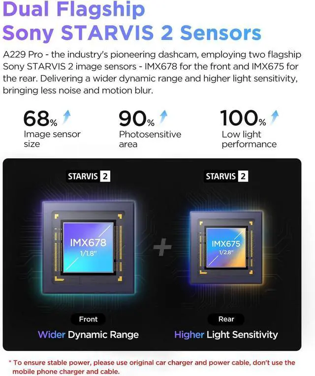 3 Channel 4K Dash Cam with STARVIS 2 Sensors The 3-channel dash cam A229 Pro 3CH is equipped with two flagship STARVIS 2 image sensors, IMX678 and IMX675. It supports 4K resolution for the front camera, 2K for the rear camera, and 1080P for the cabin camera. It delivers smooth cinematic 4K image quality and ensures effortless license plate reading and detail capturing, day and night. Providing you all-around security monitor. It' s a great choice for family trips/Uber/Lyft drivers.
