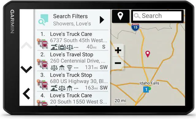 Truck & Trailer Services directory allows drivers to filter truck stops by brand or amenity, such as Loves or Showers